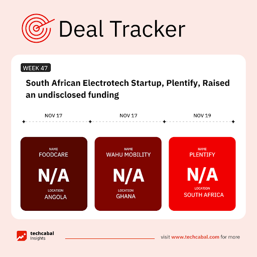 This week, Plentify, a South African electrotech startup, raised an undisclosed funding in a Series A round. The round was led by Secha Capital, Buffet Investments, E3 Capital, Fireball Capital, Endeavor SA’s Harvest Fund, Satgana, and several family offices. (Nov 19)